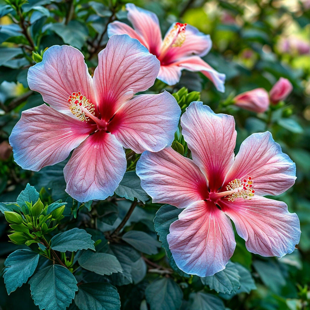 - Розовый цвет с белой серединкой: главная особенность этого сорта — его яркая и привлекательная окраска. Цветки гибискуса «Тропикал Сан» имеют насыщенный розовый цвет лепестков, создавая эффект нежности и женственности.